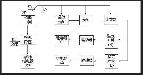 繼電器有晶體振蕩器、分頻器、整定開(kāi)關(guān)、驅(qū)動(dòng)電路和電源回路等組成。當(dāng)繼電器施加額定電壓時(shí),繼電器內(nèi)部瞬動(dòng)繼電器和兩個(gè)延時(shí)繼電器瞬時(shí)動(dòng)作,觸點(diǎn)切換,并使電源回路與計(jì)時(shí)回路處于失電狀態(tài),以提高繼電器抗干擾性能。當(dāng)輸入電壓大大降低或完全消失時(shí),瞬動(dòng)繼電器瞬時(shí)返回(兩個(gè)延時(shí)執(zhí)行繼電器仍處于動(dòng)作狀態(tài)),觸點(diǎn)也瞬時(shí)返回,使儲(chǔ)能電源接通計(jì)時(shí)回路,晶體振蕩產(chǎn)生時(shí)鐘脈沖,經(jīng)分頻后得到10ms計(jì)時(shí)脈沖,計(jì)數(shù)器對(duì)計(jì)時(shí)脈沖計(jì)數(shù),當(dāng)所計(jì)脈沖數(shù)與整定開(kāi)關(guān)值符合時(shí),驅(qū)動(dòng)執(zhí)行繼電器返回,完成斷電后延時(shí)返回的功能。原理圖如下圖所示